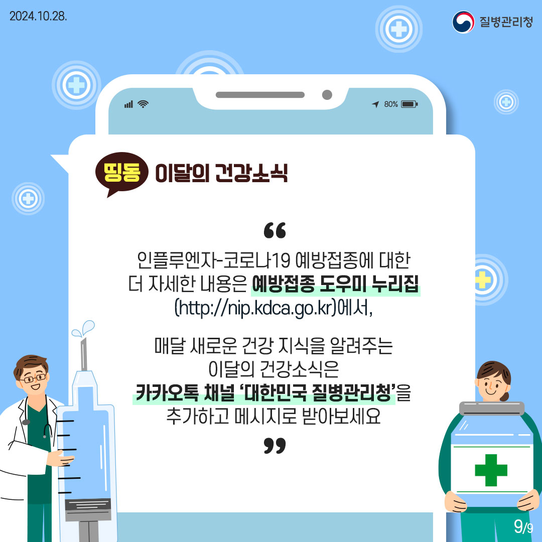 - 독감 백신: 현재 유행 중인 바이러스와 일치율이 높은 백신이 배포되고 있습니다. 특히 고위험군(65세 이상, 임신부, 어린이)은 꼭 접종하세요.