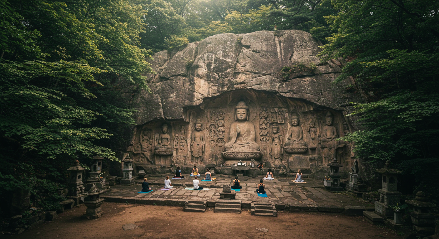 골굴사는 석굴암에서 기원한 자연 속 선원 형태로, 명상과 요가 템플스테이가 가능합니다.